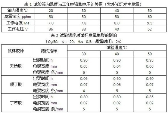 臭氧老化試驗(yàn)箱試驗(yàn)溫度的選擇通常是根據(jù)硫化橡膠使用環(huán)境的最高氣溫和試驗(yàn)設(shè)備的控溫條件等因素來(lái)確定的,另一方面還要考慮到臭氧容易受熱的作用而分解,所以臭氧老化試驗(yàn)的溫度不能過(guò)低,也不宜過(guò)高,GB/T13642-1992標(biāo)準(zhǔn)規(guī)定優(yōu)先選用的試驗(yàn)溫度為40±2℃。根據(jù)我國(guó)各地的氣候情況,最高氣溫通常達(dá)到37~44℃。在南方的夏天,氣溫經(jīng)常在30℃以上,要做30℃以下的試驗(yàn)是不可能的。但試驗(yàn)溫度也不應(yīng)超過(guò)60℃,否則,熱氧老化將逐漸起主導(dǎo)作用,而且會(huì)加速臭氧的分解,影響試驗(yàn)結(jié)果。表1示出臭氧老化試驗(yàn)箱內(nèi)溫度與發(fā)生臭氧的紫外光燈所需的電流和電壓的關(guān)系,可見(jiàn),當(dāng)溫度達(dá)到50℃時(shí),臭氧開(kāi)始分解,所需的工作電流和電壓都要相應(yīng)提高較多,才能保持所需的臭氧濃度。表2為試驗(yàn)溫度對(duì)硫化橡膠試樣臭氧龜裂影響到的試驗(yàn)結(jié)果?煽闯鰷囟葘(duì)臭氧龜裂程度影響不明顯,但對(duì)龜裂出現(xiàn)時(shí)間則有些小差別,如溫度50℃時(shí)試樣出裂時(shí)間則延遲了一些,說(shuō)明不同溫度試驗(yàn)的結(jié)果是不能作比較的。因此,采用40±2℃為試驗(yàn)溫度是比較適宜的。但GB/T13642-1992標(biāo)準(zhǔn)還推薦了可選用的其它試驗(yàn)溫度,如30±2℃或23±2℃,可供低溫度地區(qū)采用。